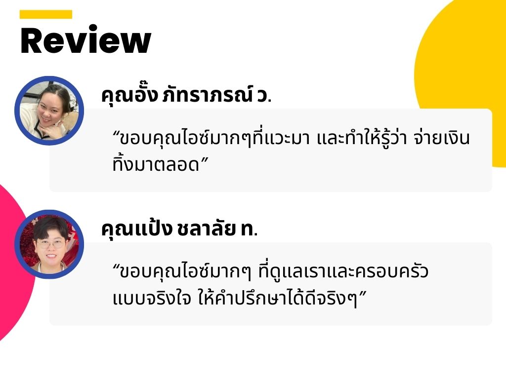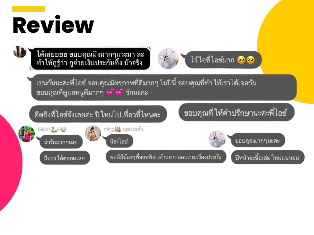 "ขอบคุณไอซ์ที่มาช่วยดูแลประกันให้ทั้งบ้าน ไม่ว่าจะเป็นของตัวเองและของคนที่บ้าน แถมยังช่วยดูแลพอร์ตการลงทุนด้วย"