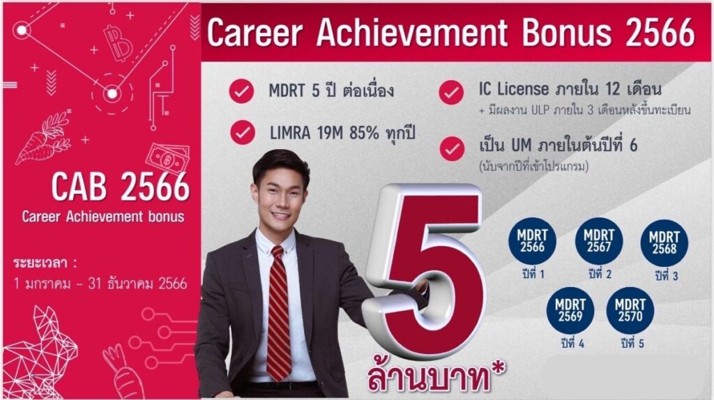 - อาชีพตัวแทนประกันชีวิตไม่ได้จำกัดแค่การขายประกันเท่านั้น แต่ยังมีโอกาสในการก้าวขึ้นเป็นผู้บริหารทีมตัวแทน หรือที่ปรึกษาทางการเงินในอนาคต