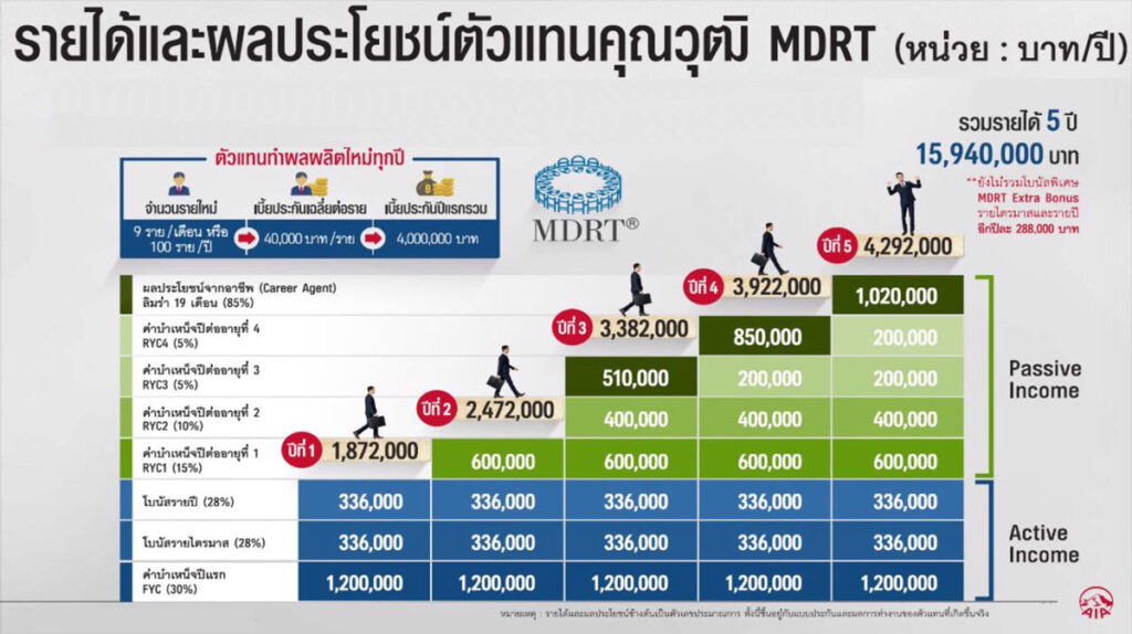 ความมั่นคงทางการเงิน: อาชีพนี้สร้างรายได้ต่อเนื่องจากการขายประกันใหม่และการต่ออายุกรมธรรม์ประจำปี “เพียงแค่คุณขายประกันในปีแรก รายได้ก็จะมาต่อเนื่องจากการต่ออายุกรมธรรม์ของลูกค้า ทำให้มีรายได้ที่ยั่งยืน”