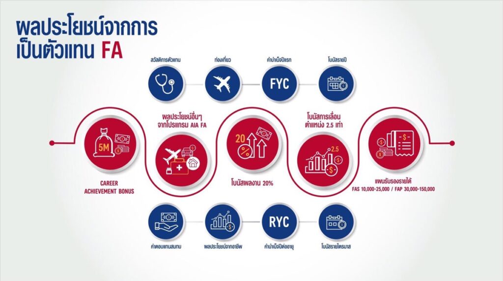 โปรแกรม AIA FINANCIAL ADVISOR (AIA FA) คือหลักสูตรฝึกอบรมเพื่อช่วยเพิ่มศักยภาพตัวแทนประกันชีวิต สู่การเป็นที่ปรึกษาด้านการประกันชีวิต และการเงินมืออาชีพ โดยในหลักสูตรมีแผนรับรองรายได้ที่คุณสามารถกำหนดเอง รวมถึงมีค่าคอมมิชชั่น และโบนัสพิเศษที่ไม่จำกัดตามความสามารถ
